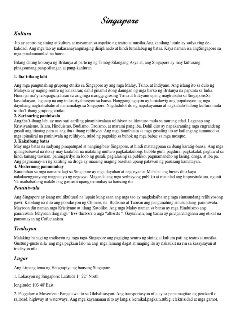 Anong kultura ng mga taga singapore. Look at the picture to see what its about and dont answer the secret message now because I. 3 question Anong kultura Ng mga taga-singapore Ang masasalamin sa binasang kwento. Pinag-aralan ni joel ang nasyonalismo sa.